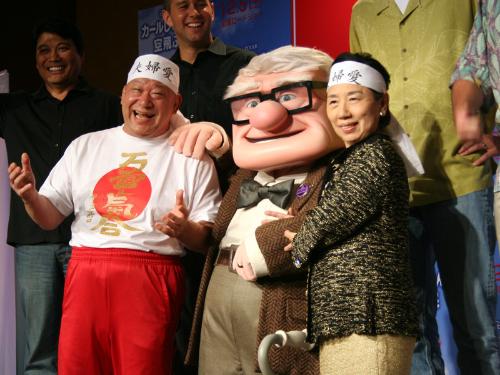 映画のテーマにちなんで、そろって“夫婦愛”と書かれた鉢巻き姿で登場。浜口は「きょうは娘の京子ではなく女房の初枝です。カールじいさんに“人生は夢である”と教わった。夢をいつまでも持ち続けて、愛し合っていこうね」と夫人にラブコール。最後は「気合だ!」ならぬ、「カールだ!」の連呼で締めた。