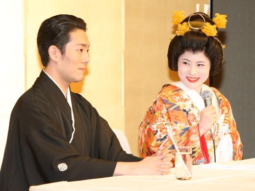 結婚会見はリラックスムード。勘太郎は鮮やかな打ち掛け姿の新妻を見つめ「僕も芝居で白無垢(むく)を着たことがありますが、こんなにきれいにはなれない」と笑った。前田は「着物がとても重たい。この重さが、きょうという日の重さなのだと思う。忘れないようにしたい」と話した。