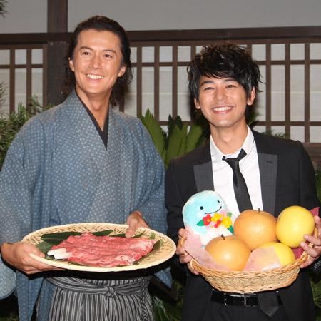 互いに物語の舞台の名産品を持ち寄り交換。妻夫木からは山形県産の米沢牛、福山からは高知県産のナシなどが贈られた。同じスタジオで収録しており、妻夫木は「久しぶりに来たら、アウェーの雰囲気がした」と苦笑。取材陣から長丁場の収録を乗り切る方法を聞かれ「土日は休みなので、金曜と土曜の夜はみんなで飲む。まとまった休みは、スタッフとボウリングでもしてハメを外す」と話すと、福山も「さっそくボウリング大会をやりたい」と意欲を見せた。