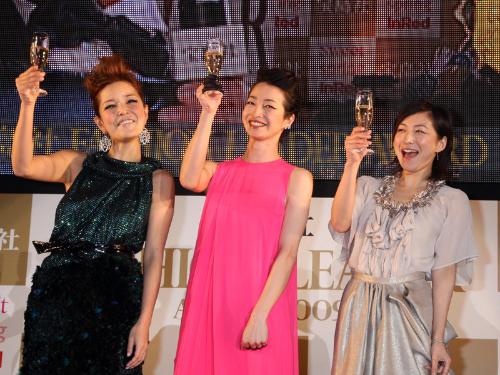 「2009ファッションリーダーアワード」の司会を務めた石田純一の音頭で、シャンパングラスを手に乾杯する受賞者の(左から)梨花、りょう、広末涼子
