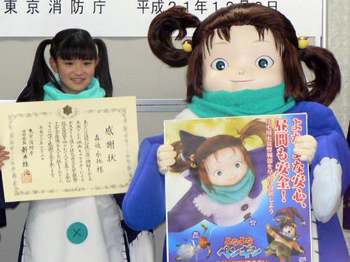 声優を務めたアニメ映画「よなよなペンギン」(23日公開)が住宅用火災警報機を呼び掛けるポスターに起用されている。主人公のココの衣装で出席し「最近もらった賞は書道の金賞。次は世界で一番演技がうまい賞が欲しい」とオスカー獲りを誓った。