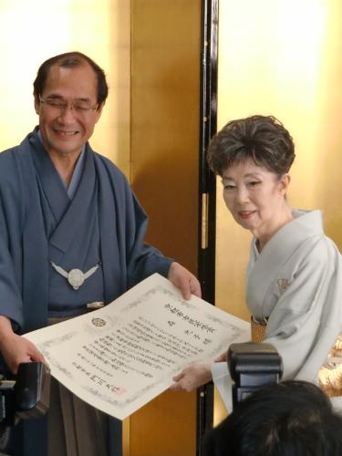 門川京都市長から表彰状を受け取り笑顔を見せる森光子