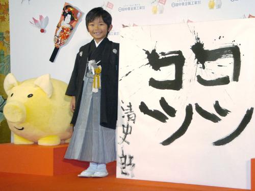 はかま姿で会場に現れた加藤は「明けましておめでとうございます」とかわいらしくあいさつ。「習字は(小学)3年生になって習うんですけど、まだ僕…2年生なので」と話していたが、同社の「はじめるコツコツキャンペーン」にちなんで「コツコツ」というお題を意外にダイナミックな字体で書き上げ、自己採点は「うーん。90点!」とニッコリ。