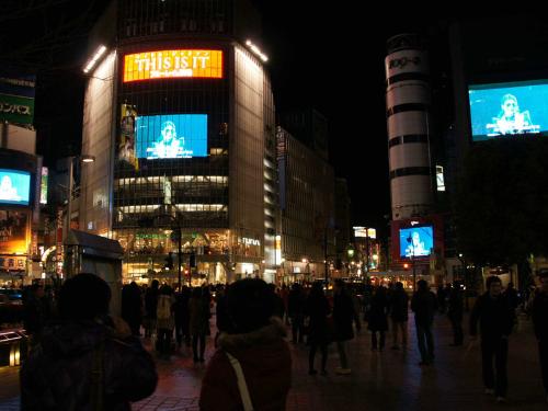 26日午前0時から1時間、渋谷駅前の大型ビジョン4面(Q’s EYE、109フォーラムビジョンなど)に遺作映画「THIS IS IT」のブルーレイとDVDのダイジェスト版、特典映像が放映された。DVDなどはこの日、店頭に並び、発売元のソニーは計200万枚を初回出荷した。