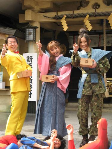 芸能プロ「サンミュージック」に所属する佐藤唯(23)、福島和可菜(27)とダンディ坂野(43)が2日、東京・四谷の須賀神社で豆まきを行った。