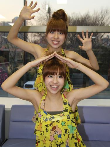 一発ギャグ「阿蘇山」を披露する「☆まかりな☆」のまり(前)とかな