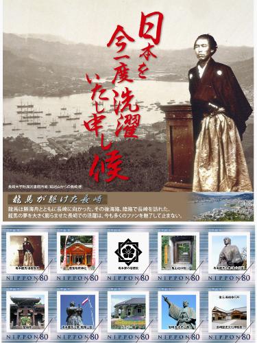 郵便局会社九州支社が、放映中のNHK大河ドラマ「龍馬伝」で人気の坂本竜馬を記念するオリジナルフレーム切手「龍馬が駆けた長崎」を、3月1日から1万6000シート限定で販売する。80円切手10枚セットで、1シート1200円。