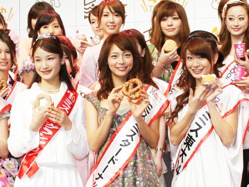 発表会ではミスタードーナツの40周年を記念し、2004年から同社のイメージ・キャラクターを務める相武、2004年度ミス東大の八田、2010年度ミス日本グランプリの林をはじめ、ミスキャンパスやご当地ミスなど全40人の“キレイどころ”が勢ぞろい。居並ぶミスたちに相武は「日本中からこんなに大勢のミス方に来ていただいて、お会いすることもないと思うので、圧巻で光栄です」。