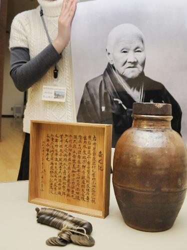 つぼは安芸市に伝わる「内原野焼」の陶器で高さ約30センチ、直径約20センチ。中には寛永通宝など177枚が入っていた。つぼが納められていた木箱には、美和が高知を離れる際に知人に譲ったことが記されており、ことし1月、その知人の子孫宅から見つかった。