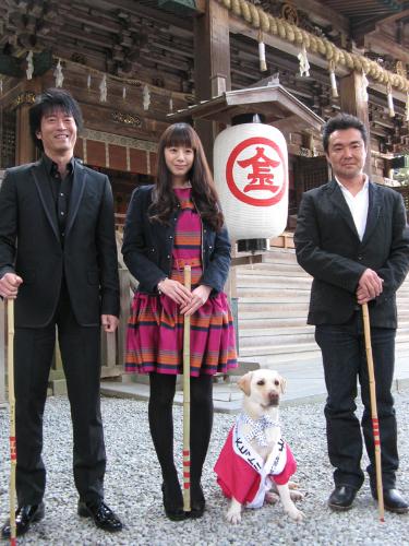 映画「きな子 見習い警察犬の物語」香川キャンペーン。撮影にも使った金刀比羅宮でヒット祈願を行った(左から)寺脇康文、夏帆、劇中できな子を演じたラブラドール・リトリーバー、小林義則監督