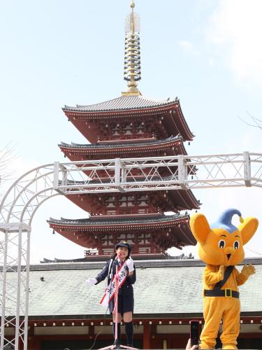 春の交通安全運動の一環で、ハーレーダビッドソンのサイドカーに乗って浅草寺周辺をパレード。境内の特設ステージでは制服姿で警視庁のマスコット「ピーポくん」のダンス付きで新曲「ノラ猫三度笠」を歌った。北海道・芽室町の母親の実家が自動車学校を経営しているそうで、最近芸能人の交通事故が相次いでいることに「交通ルールをしっかり守ってほしいですね」と訴えていた