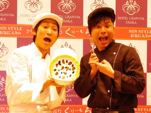 お笑いコンビ「NON STYLE」が、大阪スイーツ「くり~もろ~る」の応援団に就任し、3月31日、大阪市内で会見した。先月開催された「S-1バトル」で初代年間王者となり、賞金1億円を獲得。ただ、賞金はまだ受け取っていないようで、井上裕介(30)は「吉本が根こそぎ持っていくっていうウワサがあります」と笑わせた。