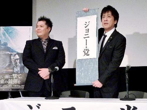 お笑いコンビのブラックマヨネーズ(小杉竜一、吉田敬)が香港・フランス合作のハードボイルドアクション映画「冷たい雨に撃て、約束の銃弾を」(ジョニー・トー監督、15日公開)をPRするため新党「ジョニー・党」を結成した。