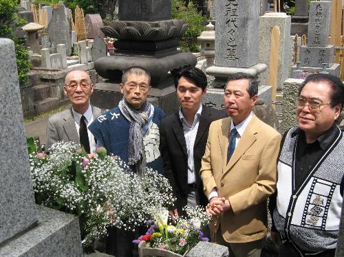 五代目小さんの墓参りをする左から入船亭扇橋、柳家小三治、孫の柳家花緑、六代目小さん、鈴々舎馬風