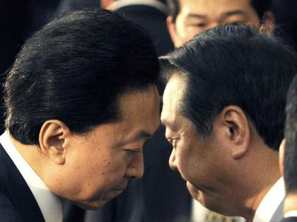 民主党の両院議員総会に臨む鳩山首相(左)と小沢幹事長