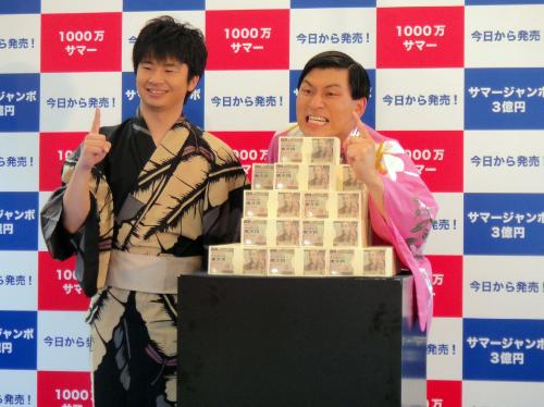 お笑いコンビのオードリーが7日、東京・西銀座で「サマージャンボ宝くじ」と「1000万サマー」の発売開始イベントに参加した。