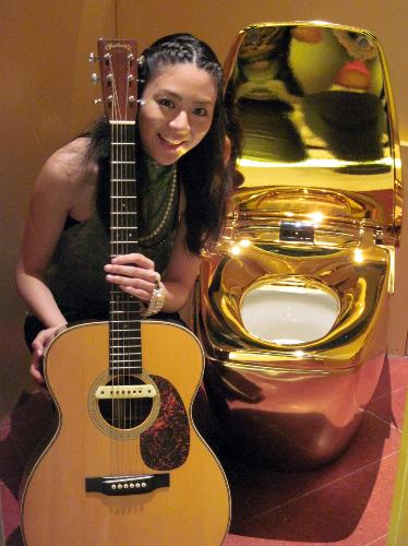 ライブ前には陶器部分に純金を練り込み、金メッキを施したパビリオンの目玉「世界一トイレ」を見学。“話題になったトイレ”同士のご対面に「ご縁を感じました。こんなトイレを磨いたら世界一のべっぴんさんになれるかも」。金便器は推定700万円。トイレでブレークしただけに、もっと売れたら購入するかと聞かれ「ステキですが、普通のトイレを買って、残りは好きな物を買う」とはにかんだ。