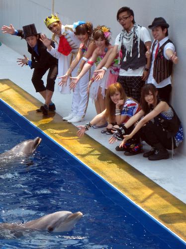 イルカと戯れる「Berryz工房」の夏焼雅(手前左)熊井友理奈(手前右)と「T―Pistonz+KMC」メンバー(後列)