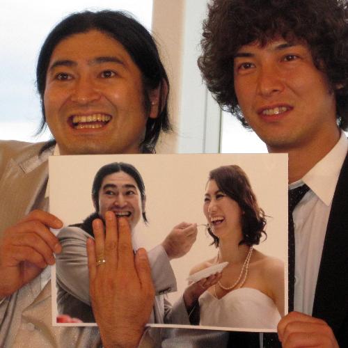 吉本興業から300万円借金して実現した披露宴。石田純一・東尾理子夫妻の披露宴と重なる中、新聞社など11媒体、20人以上の報道陣が集まり「まさかこんなに」と喜んだ。婿養子に入り、本名は鈴木から夫人の猪熊姓に。松田は「なぜ婿養子?イノクマの名字が面白かったのと、遺産目当てです」と“暴露”、会場は爆笑に包まれた。