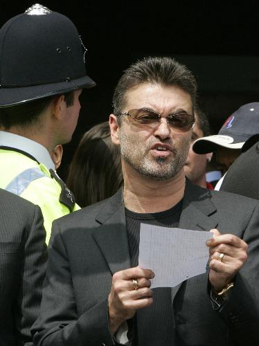 ロンドンの裁判所で、薬物を使用して車を運転した罪で有罪判決を受けた後、声明を読み上げるジョージ・マイケル容疑者=07年6月
