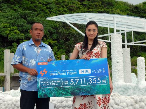 KDDIが、運営するauの機能「au Smart Sports Run&Walk」で集まった金額を沖縄のサンゴの保全活動のために寄付。「みんなの気持ちがもっとサンゴに向くように自然環境を良くしていかなければいけないと思いました」とあいさつした。