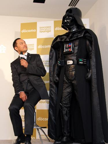 司会者がベイダー卿にも感想を求めると「フォー」と例の吐息をもらしたが、すかさず渡辺が「“とても楽しんだ”と言っています」と通訳。続いて「多機能なので通訳もできるんです」と徹底的にケータイになり切っていた。