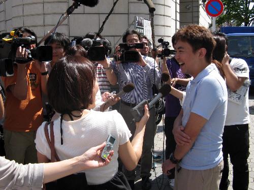取材陣に囲まれ、路上で取材に応じる林家三平(右)