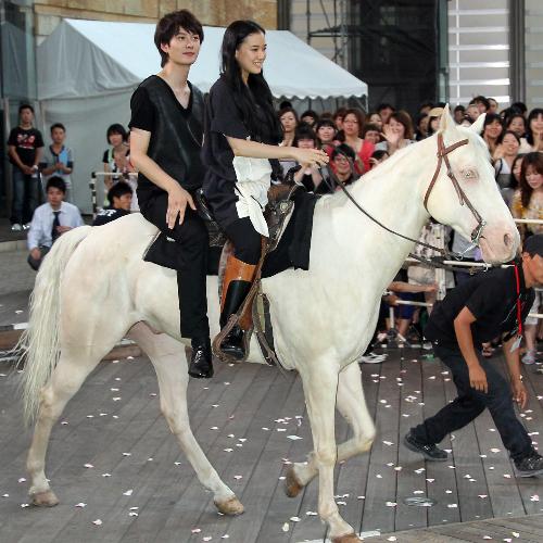 映画「雷桜」のPRイベントで一緒に馬に乗って登場した蒼井優と岡田将生(左)