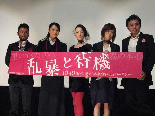 「乱暴と待機」の舞台あいさつを行った(左から)山田孝之、小池栄子、美波、原作者の本谷有希子さん、冨永昌敬監督