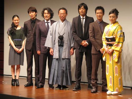 映画5社による時代劇PRキャンペーンに参加した(左から)蒼井優、岡田将生、役所広司、岡田武史氏、大沢たかお、堺雅人、仲間由紀恵