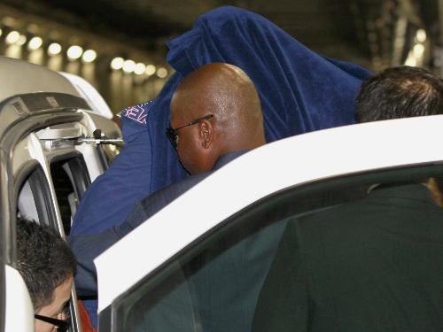 入国審査手続きの再開のため、青い布をかぶり車を降りるパリス・ヒルトン