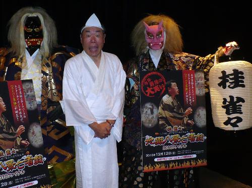 落語家の桂雀々(50)が14日、大阪市内で会見し、12月12日に和歌山市内のテーマパーク「ポルトヨーロッパ」内で開くスーパー落語「桂雀々 地獄八景亡者戯2010ファイナル」をPRした。