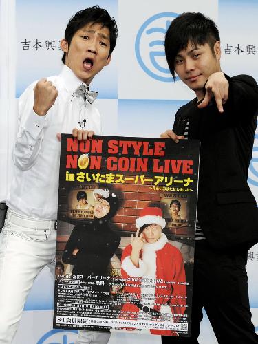 お笑いコンビ「NON STYLE」が22日、12月23日にさいたま市で開く1万人規模の無料ライブ「NON STYLE NON COIN LIVE in さいたまスーパーアリーナ」の制作発表を都内で行った。