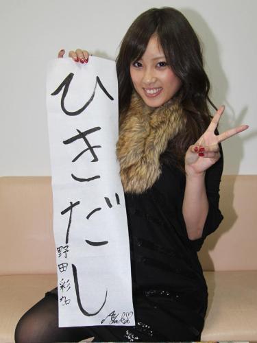 【アイドル書初め 2011年の野望】2008年ミスフラッシュ準グランプリを受賞したグラビアアイドルの野田彩加(22)は、平仮名で「ひきだし」としたためた。「一番欲しいのはしゃべりに関する引き出しですね。トークでも、レポートの仕事でも、面白く伝えられるように」と言葉に込めた思いを説明した。