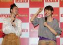 女優の長澤まさみ(23)と武井咲(えみ、17)が9日、東京の原宿にオープンしたロッテの「ガーナ 手づくりチョコサポートハウス」に第1号の客として来店した。