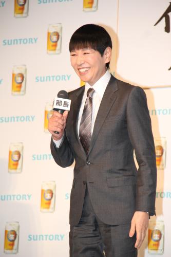 サントリー「ジョッキ生」新CM発表会に部長と書かれたマイクを手にして笑顔を見せる和田アキ子