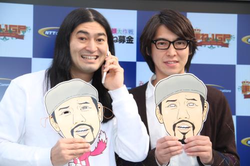 「まね―1GP みんな笑顔大作戦」は、音声でモノマネの巧拙を診断できる携帯サイト「まね―1GP」の通話料を「国境なき医師団」へ寄贈するキャンペーン。当企画の隊長は戦場カメラマンの渡部陽一氏(38)が務めるが、松田洋昌(34)は「渡部さんは忙しいので、スケジュール空いている僕らが来ました」と自虐まじりに話した。