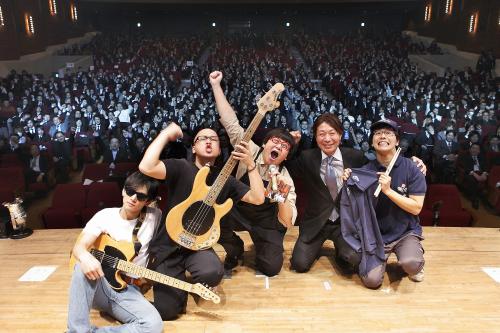 会いに行けるロックバンドとして話題の「花団」が23日、都内で寿司宅配チェーン「銀のさら」の全国集会でライブを行った。
