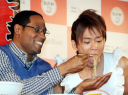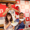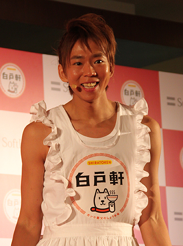 お笑いタレントの楽しんご(31)が1日、都内のソフトバンクモバイル本社にて行われた「白戸軒」ラーメンプレゼントキャンぺーン記念イベントに大食いタレントのギャル曽根(25)、同社のCMに出演しているダンテ・カーヴァー(34)とともに登場した。