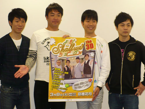 京橋花月で8日に開かれる「よしもとShall weショッピングthe3D」の会見が3日、大阪市内であり、藤井隆(38)、たむらけんじ(37)、モンスターエンジンが出席した。