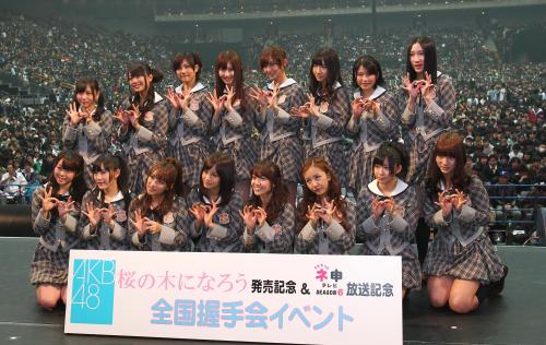 AKB48・握手会イベント。壇上で笑顔を見せる(前列左から)峯岸みなみ、渡辺麻友、高橋みなみ、前田敦子、大島優子、板野友美、指原莉乃、高城亜樹、(後列左から)大場美奈、北原里英、宮澤佐江、小嶋陽菜、篠田麻里子、柏木由紀、横山由依、鈴木紫帆里 AKB48新アルバムに総勢200人バラード曲 ギャラリーで見る この記事のフォト 2011年03月06日の画像一覧 もっと見る 2011年03月06日の画像をもっと見る