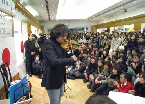 東日本大震災の被災者を支援する義援金を募るため、バイオリニスト葉加瀬太郎が14日夜、ロンドン中心部の繁華街ピカデリーサーカス近くの日系百貨店「ロンドン三越」店舗内でチャリティーコンサートを2回に分けて開催、ロンドン在住の日本人を中心に計約400人が訪れた。