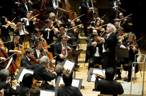 29日、ベルリンで開かれた被災者支援の特別公演で、ベルリン・フィルハーモニー管弦楽団を指揮するサイモン・ラトル氏(ベルリン・フィル提供、モニカ・リターハウス氏撮影・共同)
