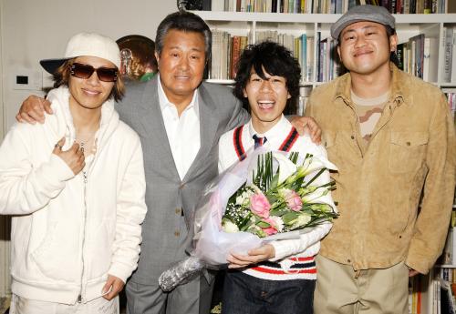 Jam9の新曲ミュージックビデオに出演する梅宮辰夫(左から2人目)とJam9