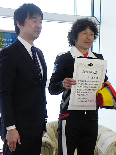 「2年2カ月走ると、(体調が)治るのにも同じ期間かかる」と、当面は走らない意向。10月30日に控える第1回大阪マラソンで、「走ってとは言わないが、市民ランナーを応援して」と知事に頼まれると、「やらせてもらいたい」と前向きに答えた。同賞は大阪府が府民に深い感動を与え、府の施策に貢献した人に授与される。