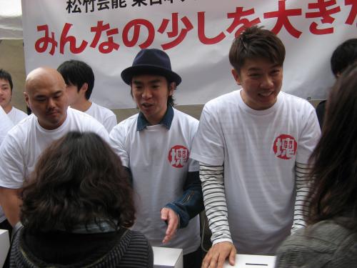 被災者を支援するため、「よゐこ」「ますだおかだ」など「松竹芸能」に所属するお笑いタレントが17日、東京・新宿でチャリティーライブと募金活動を行った。