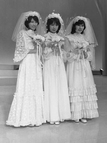 78年1月30日、NHK「レッツゴーヤング」でウエディングドレス姿を披露するキャンディーズ。(左から)藤村美樹さん、伊藤蘭、田中好子さん