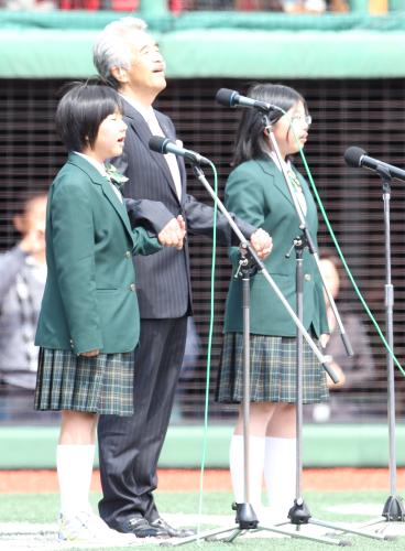試合前、宮城県南三陸町で被災した女子中学生2人と手をつないで国歌を斉唱した。球団から国歌斉唱の依頼を受け、被災者や避難者を元気づけようと自ら企画。「2人は精いっぱい大きな声で歌ってくれた。ナインの心にも届いたと思う」と感激した。