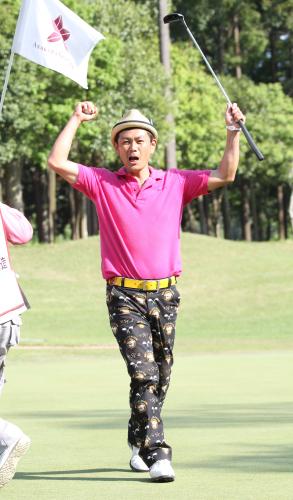 18ホール、著名人の部で優勝を決めたココリコの遠藤章造は気合のガッツポーズ