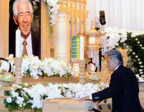 参列者を代表し、「仁義なき戦い」で主演した菅原文太(77)が「昨日朝、岡田さんという大木が倒れる音が聞こえた。でも心配しないでください。後のヒノキが育ち、世の中にパンチを食らわす作品が必ず生まれます」と別れの言葉を述べた。
